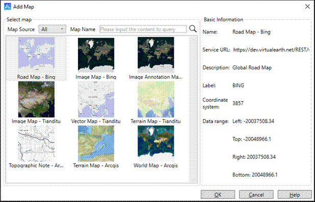 Puede importar fuentes de mapas de uso común, como Bing Maps, y la importación de servicios de mapas estándar OGC.